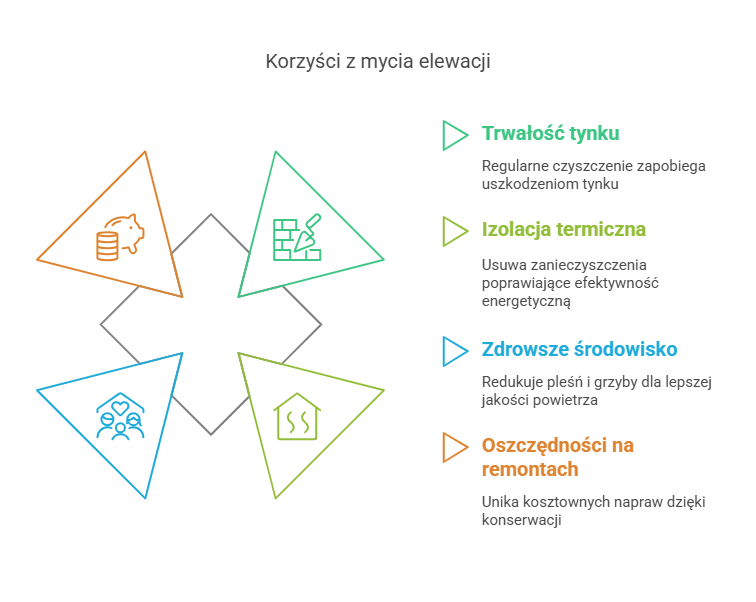 🏡 Lepsza izolacja termiczna – warstwa kurzu i glonów może obniżać właściwości termoizolacyjne ścian.